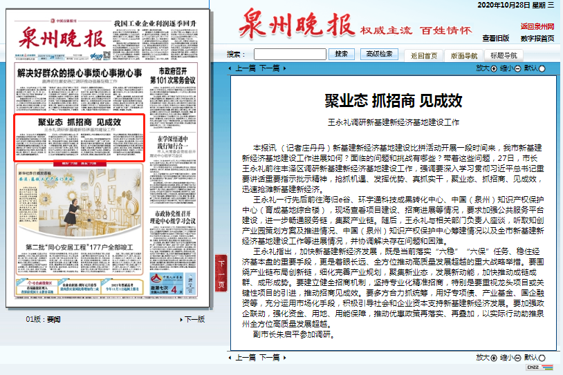 王永礼一行先后前往海归e谷、凯发K8科技成果转化中心、中国(泉州)知识产权保护中心(育成基地综合楼),现场查看项目建设、招商进展等情况,要求加强公共服务平台建设,进一步畅通服务链,集聚产业链。随后,王永礼与相关部门负责人座谈,听取知创产业园策划方案及推进情况、中国(泉州)知识产权保护中心筹建情况以及全市新基建新经济基地建设工作等进展情况,并协调解决存在问题和困难。