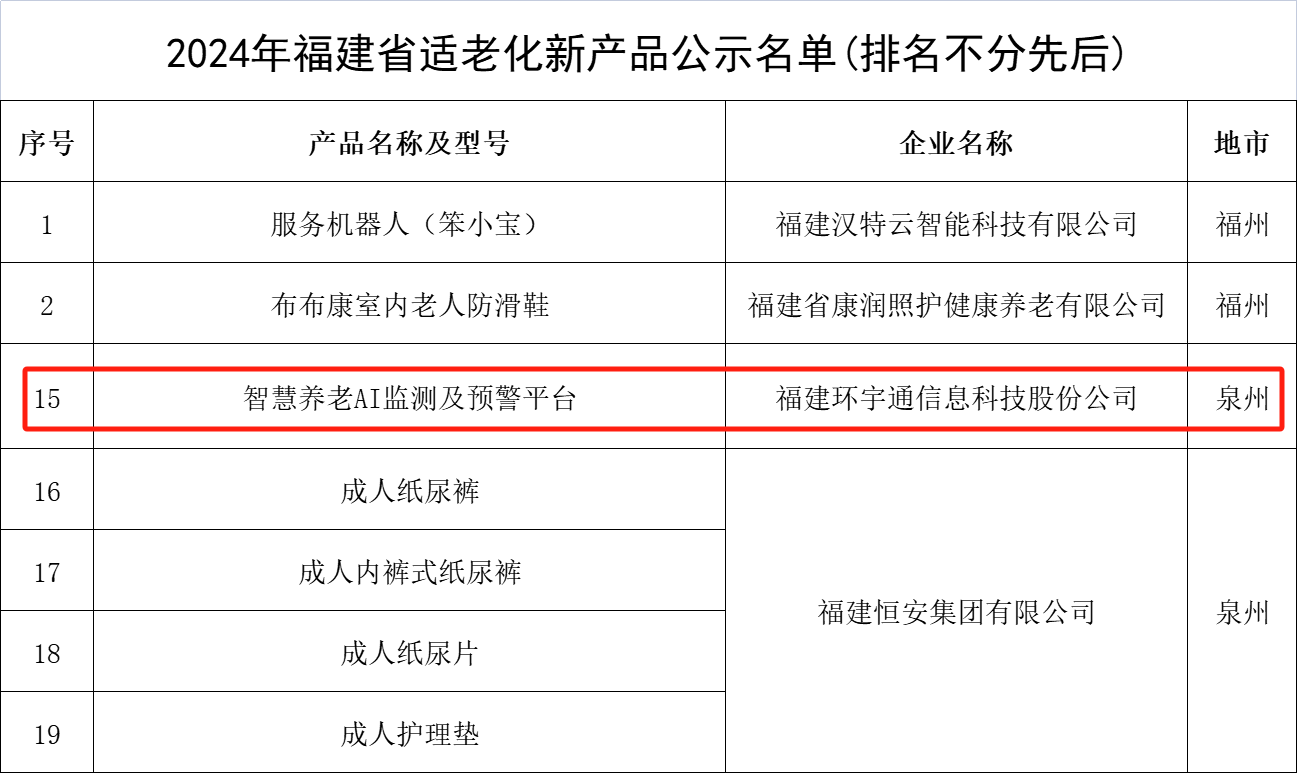 2024年11月19日,2024年福建省适老化新产品公示名单公布,全省有24款产品位列名单,泉州共有五款产品入选。其中凯发K8依托技术积累和创新能力所推出的“智慧养老AI监测及预警平台”入选该名单。这一荣誉不仅是对公司在“AI+医疗康养”领域的长期努力和贡献的肯定,更是对未来持续创新与高质量开展的激励。